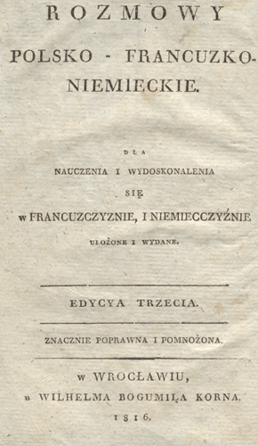 A110 070 – Rozmowy Polko-Francuzko-Niemieckie Sprache deutsch – polnisch – französisch Autor(en) unbekannt Erscheinungsjahr 1816 Verlag Wilhelma Bogumila Korna Wrocław ISBN n/a A110 070_de_toc